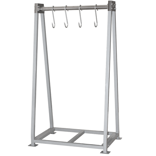 Стойки для подвешивания туш долговечны, не подвержены коррозии, легко поддающиеся очистке. Имеют, в дополнительной комплектации, лотки для стекания воды. Такие стойки могут изготавливаться как полностью из нержавеющей стали, так и из металла с полимерным покрытием. Крючки для подвешивания поставляются в комплекте.
