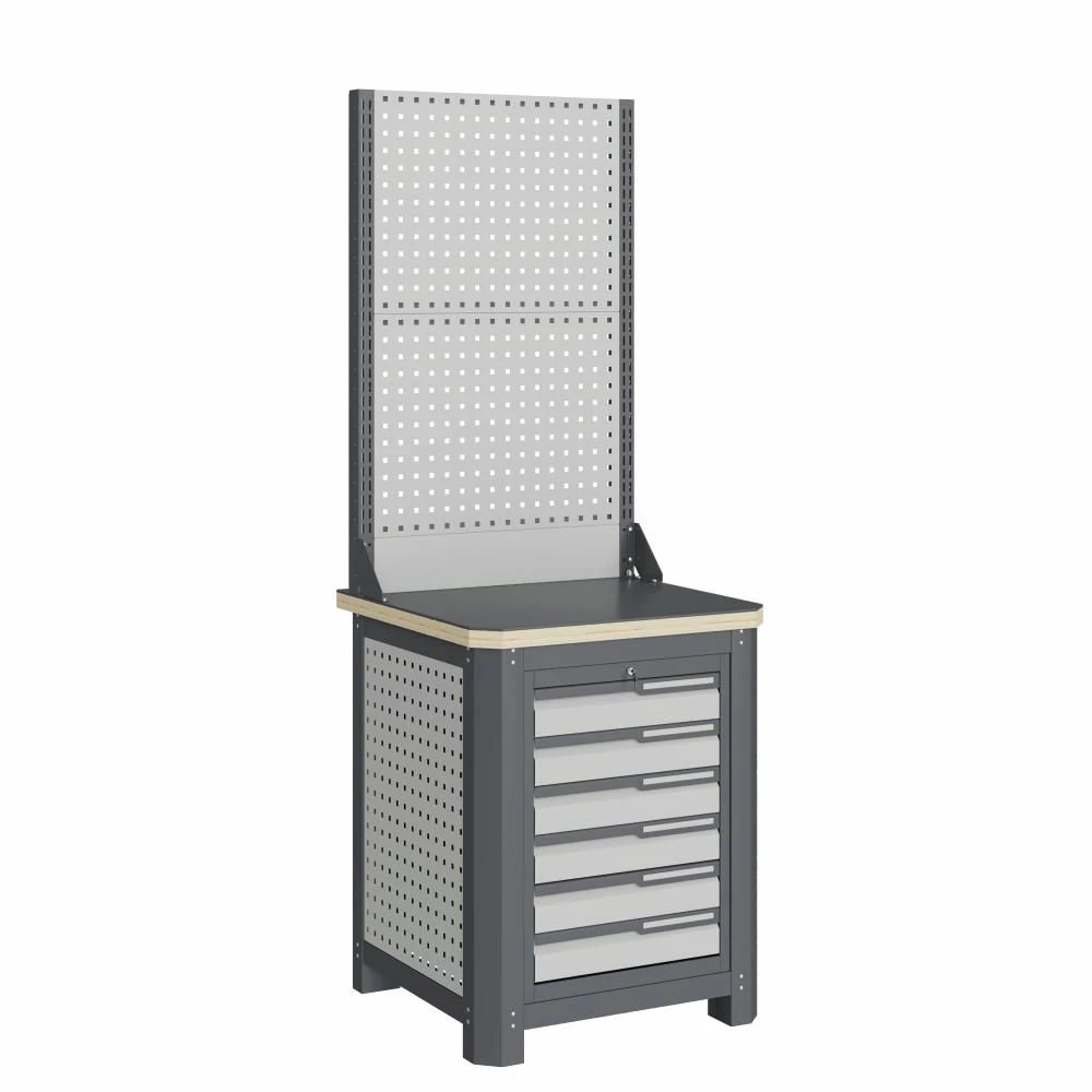 - Экран (перфорированная панель) верстака выполнен с квадратной перфорацией 12х12 мм с шагом 38 мм для установки крючков, держателей и других аксессуаров. Экран крепятся к столешнице с помощью специальных кронштейнов. Максимальная масса груза, равномерно распределенного по поверхности экрана, составляет 71 кг.