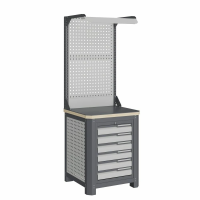 - Экран (перфорированная панель) верстака выполнен с квадратной перфорацией 12х12 мм с шагом 38 мм для установки крючков, держателей и других аксессуаров. Экран крепятся к столешнице с помощью специальных кронштейнов. Максимальная масса груза, равномерно распределенного по поверхности экрана, составляет 71 кг.