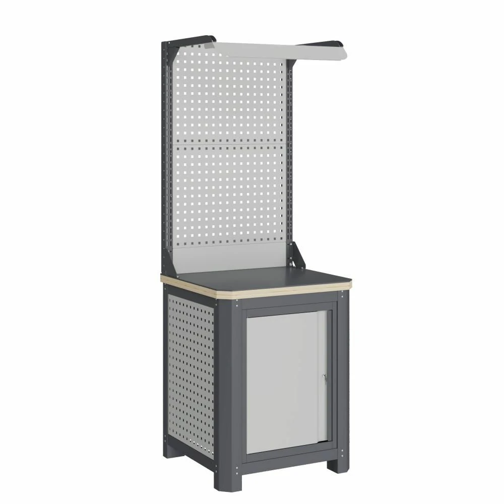 - Экран (перфорированная панель) верстака выполнен с квадратной перфорацией 12х12 мм с шагом 38 мм для установки крючков, держателей и других аксессуаров. Экран крепятся к столешнице с помощью специальных кронштейнов. Максимальная масса груза, равномерно распределенного по поверхности экрана, составляет 71 кг.