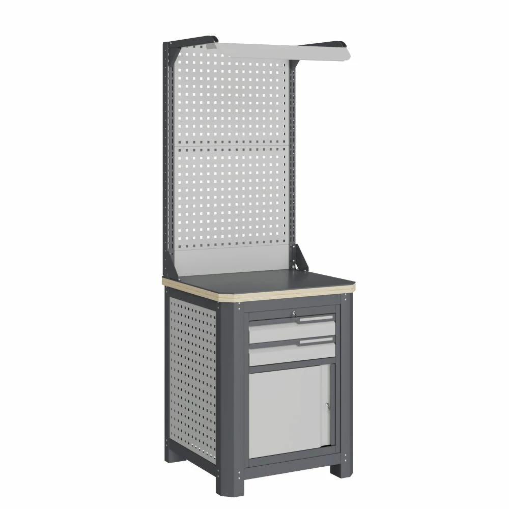 - Экран (перфорированная панель) верстака выполнен с квадратной перфорацией 12х12 мм с шагом 38 мм для установки крючков, держателей и других аксессуаров. Экран крепятся к столешнице с помощью специальных кронштейнов. Максимальная масса груза, равномерно распределенного по поверхности экрана, составляет 71 кг.