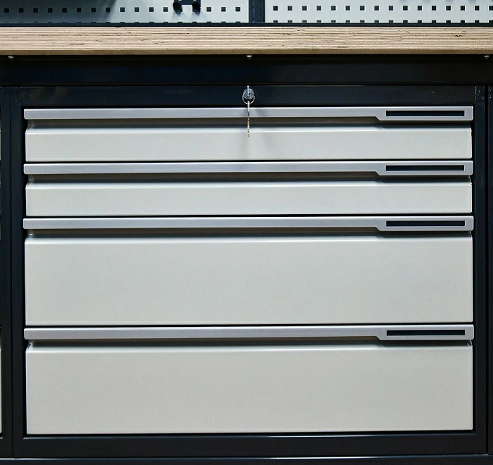 - Модуль верстака выполнен сварными. Ящики в модулях устанавливаются на шариковых телескопических направляющих полного выдвижения.