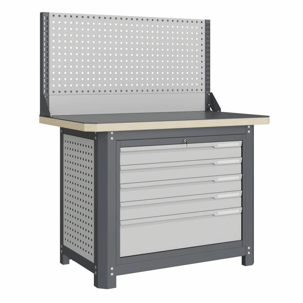 - Экран (перфорированная панель) и элементы боковые верстака выполнены с квадратной перфорацией 12х12 мм с шагом 38 мм для установки крючков, держателей и других аксессуаров. Экран крепятся к столешнице с помощью специальных кронштейнов. Максимальная масса груза, равномерно распределенного по поверхности экрана, составляет 71 кг.