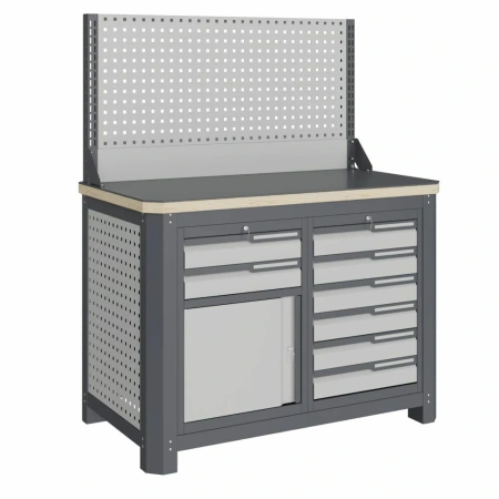 - Экран (перфорированная панель) и боковые элементы верстака выполнены с квадратной перфорацией 12х12 мм с шагом 38 мм для установки крючков, держателей и других аксессуаров. Экран крепятся к столешнице с помощью специальных кронштейнов. Максимальная масса груза, равномерно распределенного по поверхности экрана, составляет 71 кг.