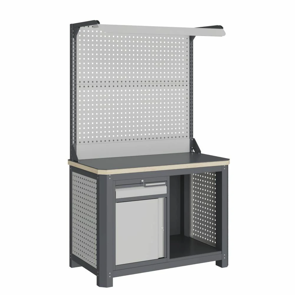 - Экран (перфорированная панель) и боковые элементы верстака выполнены с квадратной перфорацией 12х12 мм с шагом 38 мм для установки крючков, держателей и других аксессуаров. Экран крепятся к столешнице с помощью специальных кронштейнов. Максимальная масса груза, равномерно распределенного по поверхности экрана, составляет 71 кг.