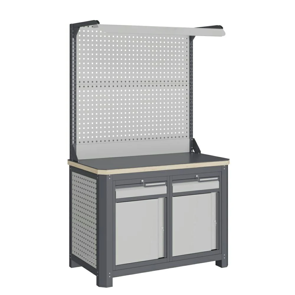 - Экран (перфорированная панель) и боковые элементы верстака выполнены с квадратной перфорацией 12х12 мм с шагом 38 мм для установки крючков, держателей и других аксессуаров. Экран крепятся к столешнице с помощью специальных кронштейнов. Максимальная масса груза, равномерно распределенного по поверхности экрана, составляет 71 кг.