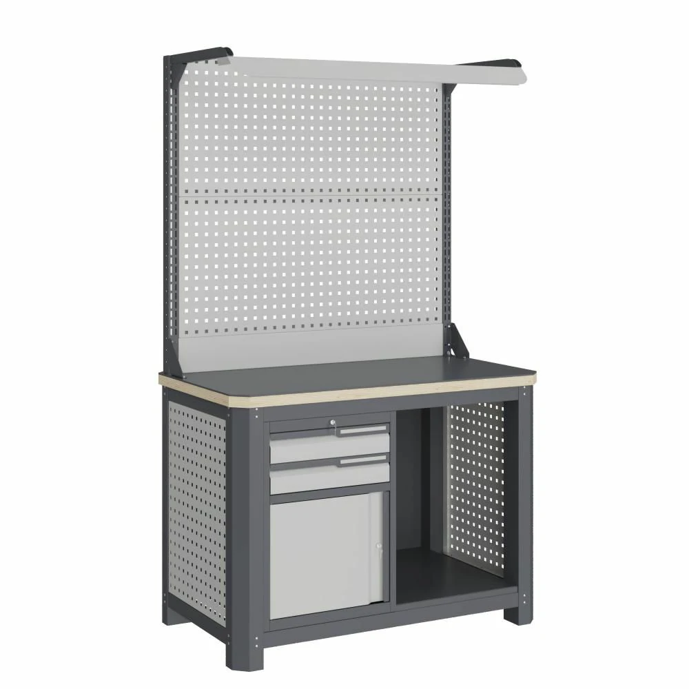 - Экран (перфорированная панель) и боковые элементы верстака выполнены с квадратной перфорацией 12х12 мм с шагом 38 мм для установки крючков, держателей и других аксессуаров. Экран крепятся к столешнице с помощью специальных кронштейнов. Максимальная масса груза, равномерно распределенного по поверхности экрана, составляет 71 кг.