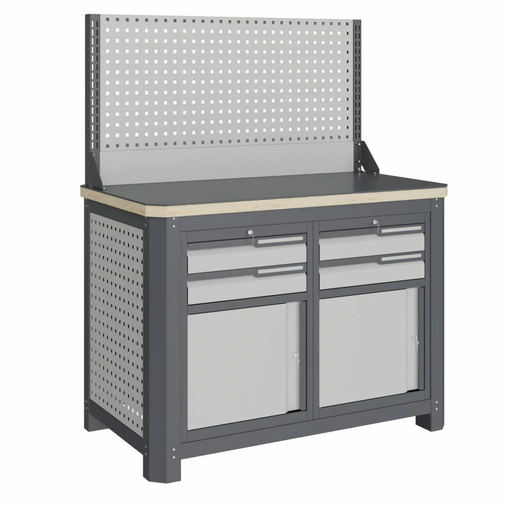 - Экран (перфорированная панель) и боковые элементы верстака выполнены с квадратной перфорацией 12х12 мм с шагом 38 мм для установки крючков, держателей и других аксессуаров. Экран крепятся к столешнице с помощью специальных кронштейнов. Максимальная масса груза, равномерно распределенного по поверхности экрана, составляет 71 кг.