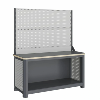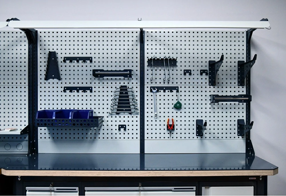 - Экран (перфорированная панель)и боковые элементы верстака выполнены с квадратной перфорацией 12х12 мм с шагом 38 мм для установки крючков, держателей и других аксессуаров. Экран крепятся к столешнице с помощью специальных кронштейнов. Максимальная масса груза, равномерно распределенного по поверхности экрана, составляет 71 кг.