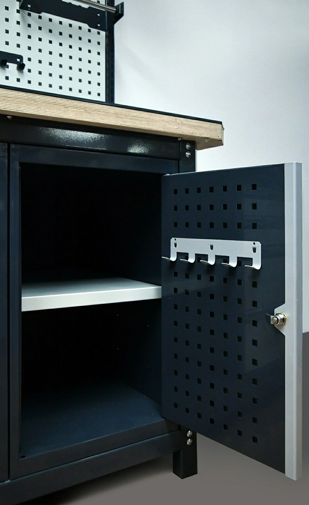 - Экран (перфорированная панель) и боковые элементы верстака выполнены с квадратной перфорацией 12х12 мм с шагом 38 мм для установки крючков, держателей и других аксессуаров. Экран крепятся к столешнице с помощью специальных кронштейнов. Максимальная масса груза, равномерно распределенного по поверхности экрана, составляет 71 кг.