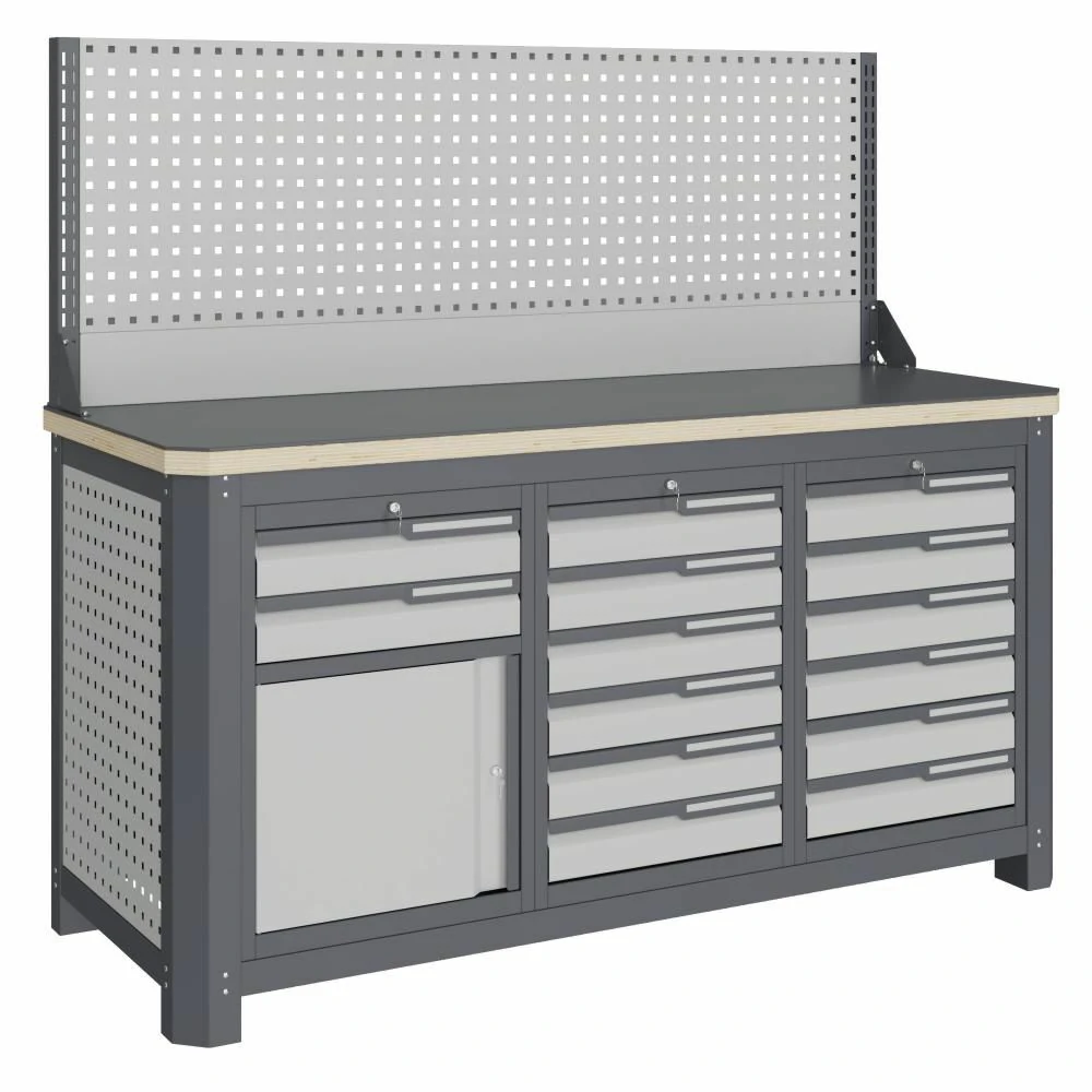 - Экран (перфорированная панель) и боковых элементов верстака выполнены с квадратной перфорацией 12х12 мм с шагом 38 мм для установки крючков, держателей и других аксессуаров. Экран крепятся к столешнице с помощью специальных кронштейнов. Максимальная масса груза, равномерно распределенного по поверхности экрана, составляет 71 кг.