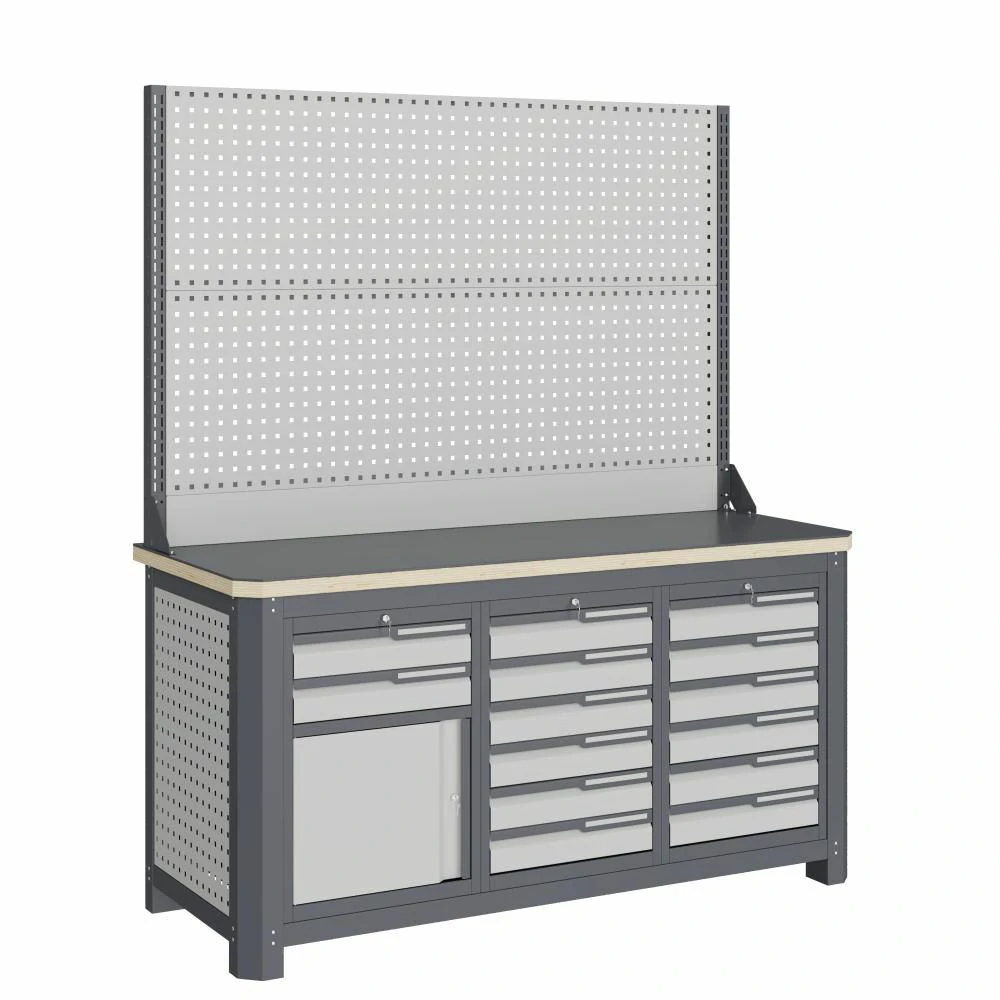 - Экран (перфорированная панель) и боковых элементов верстака выполнены с квадратной перфорацией 12х12 мм с шагом 38 мм для установки крючков, держателей и других аксессуаров. Экран крепятся к столешнице с помощью специальных кронштейнов. Максимальная масса груза, равномерно распределенного по поверхности экрана, составляет 71 кг.