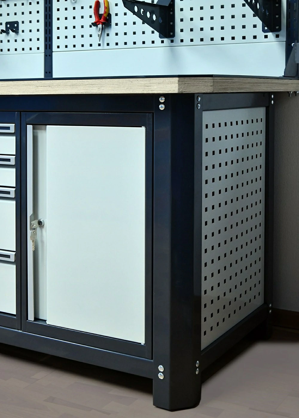 - Квадратная перфорация на элементах верстака предназначена для установки крючков, держателей и других аксессуаров, имеет размеры: квадрат 12х12 мм, с шагом 38 мм.