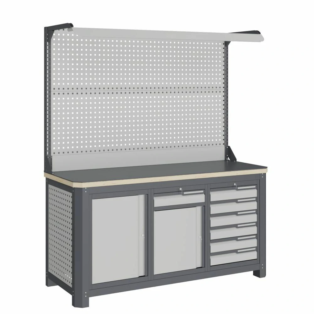 - Экран (перфорированная панель) и боковые элементы верстака выполнены с квадратной перфорацией 12х12 мм с шагом 38 мм для установки крючков, держателей и других аксессуаров. Экран крепятся к столешнице с помощью специальных кронштейнов.