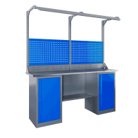 Верстак оснащен двумя объемными тумбами, которые разделены на две полки внутри. Каждая тумба имеет замок для надежного хранения инструментов. Между тумбами внизу располагается полка для складирования больших по размерам предметов.