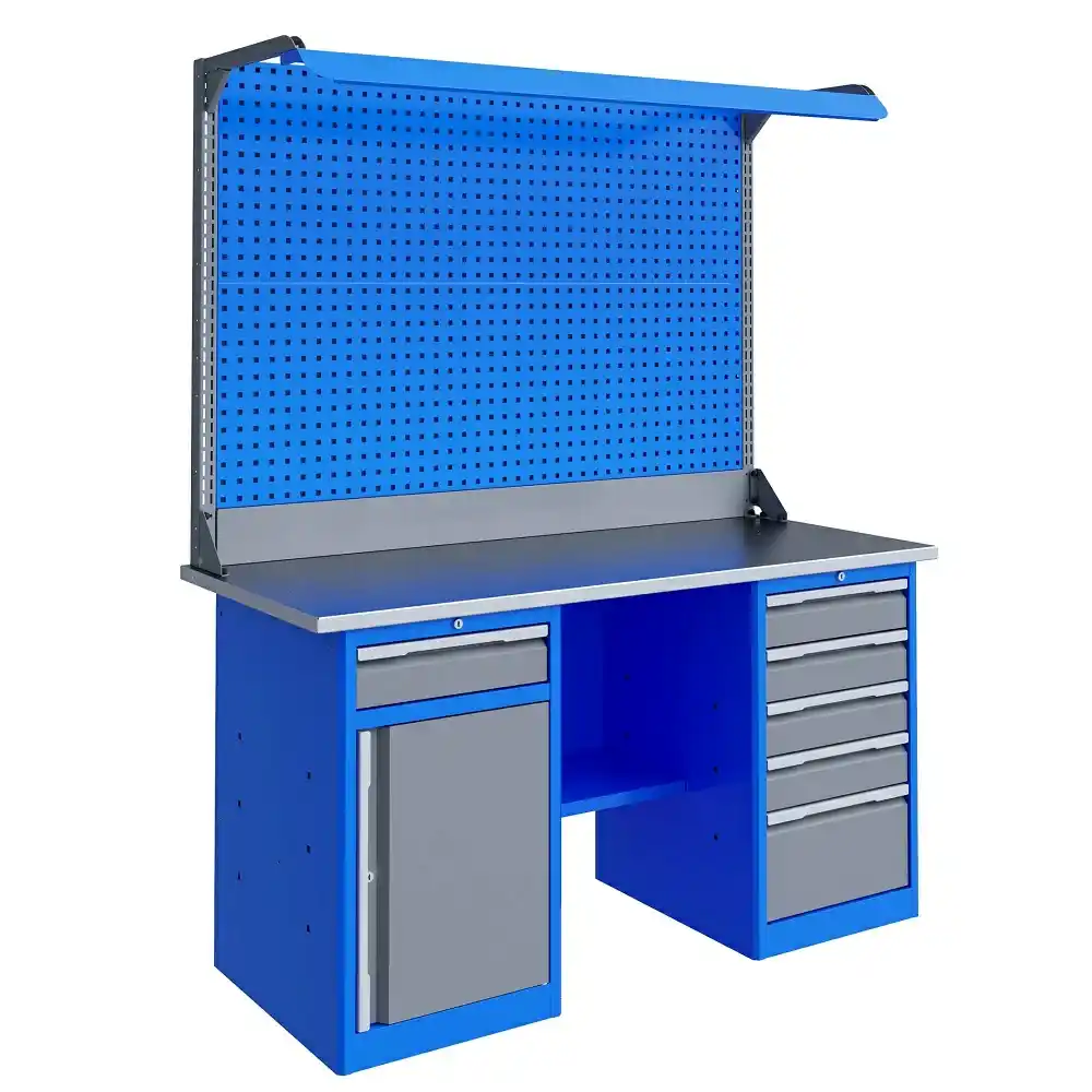 - Организация хранения: Полка-стенка: Под столешницей для габаритного инструмента.Сварные тумбы: Оснащены шариковыми направляющими полного выдвижения.Тумба P5: 4 малых ящика (103x397x520 мм), 1 большой ящик (222x397x520 мм), общий центральный замок.Тумба P8: 1 малый ящик (с замком) и отделение с регулируемой полкой и реверсивной дверцей (с замком). В комплекте 2 ключа на замок.
