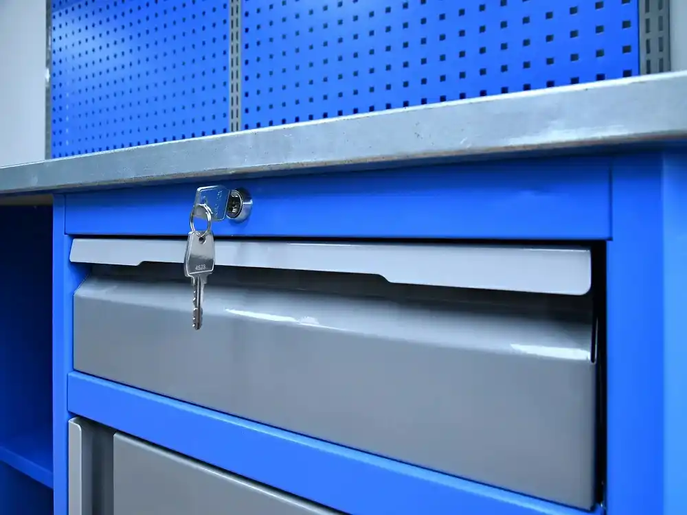- Тумбы верстаков выполнены сварными. Ящики в тумбах устанавливаются на шариковых телескопических направляющих полного выдвижения. В тумбах P5 установлено четыре малых и один большой ящик. Внутренние размеры малых ящиков (ВхШхГ), не более: 103 х 397 х 520 мм. Внутренние размеры больших ящиков (ВхШхГ), не более: 222 х 397 х 520 мм. Тумбы с ящиками снабжены общим центральным замком с поворотом ригеля 180º и подпружиненной тягой. В комплекте два ключа с каждой тумбой.