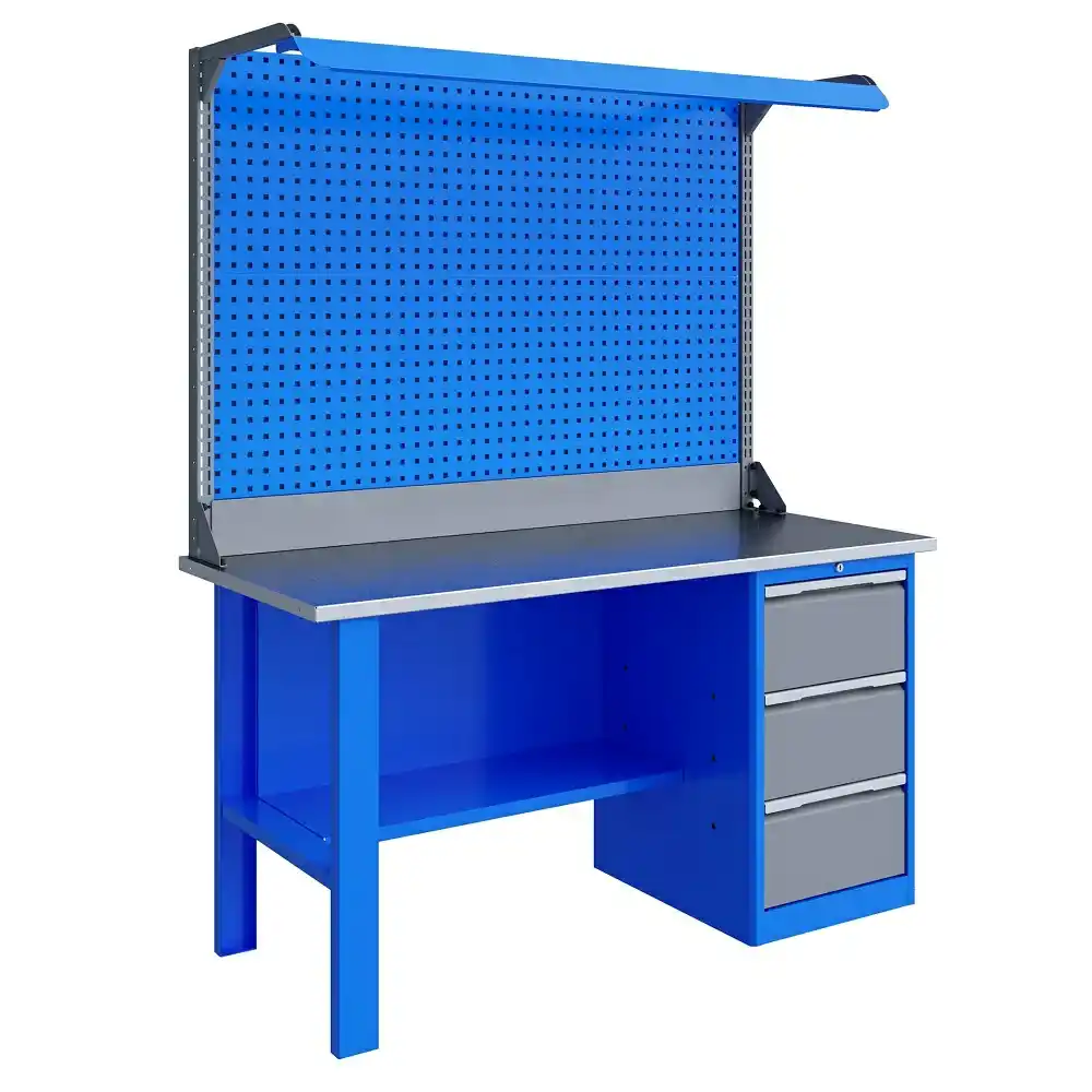 Равномерно распределенная нагрузка на двойной экран - 100 кг. - Комплект освещения устанавливается над верстаком. В комплекте: защитный козырек, кронштейны и лампа с магнитными креплениями, которые позволяют менять ее положение.