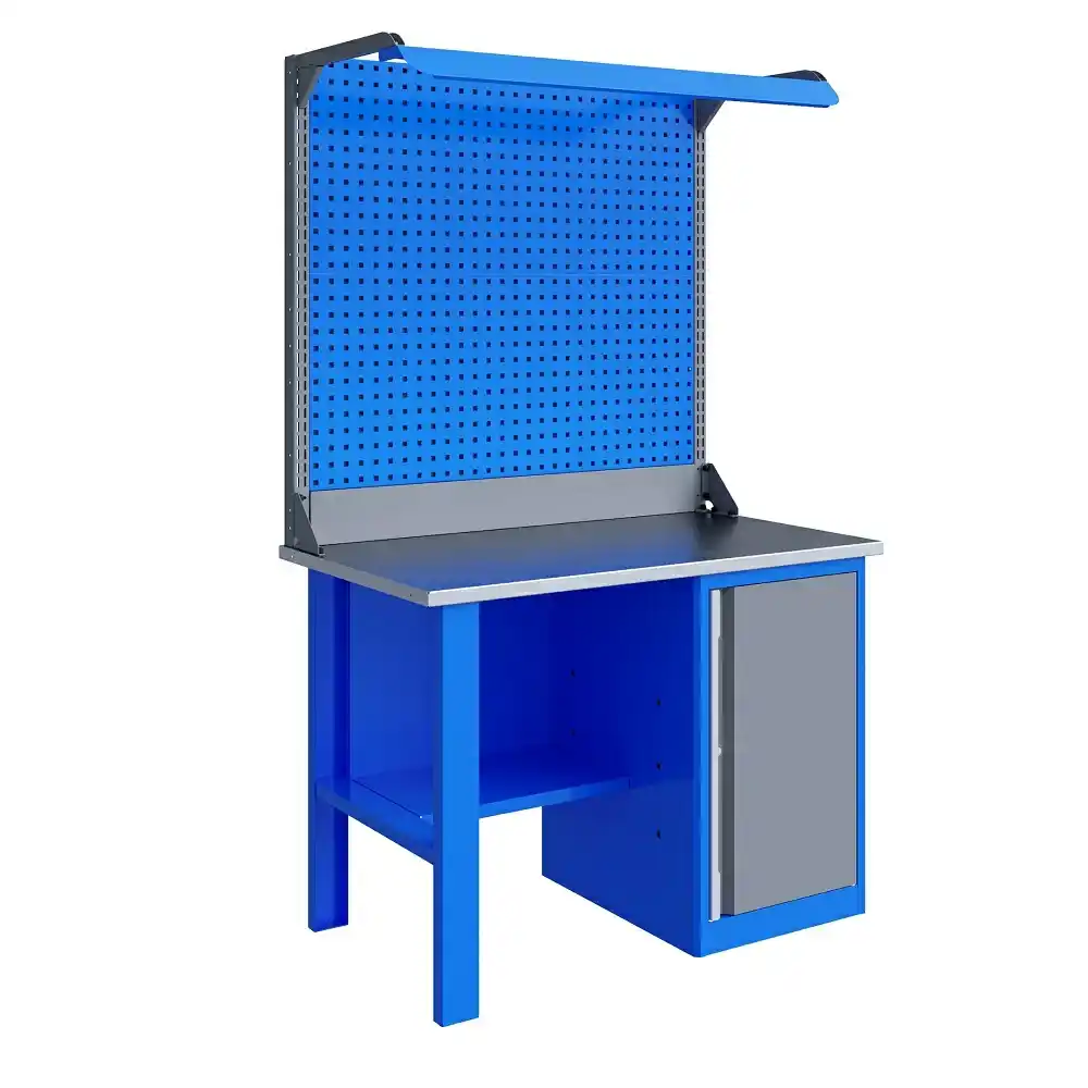 - Верстак комплектуется полкой-стенкой, расположенной под столешницей для удобного размещения габаритного инструмента и оснастки.