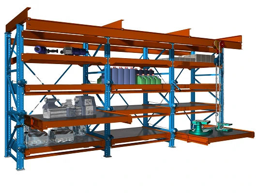 Стеллажи с выкатными платформами (полками) предназначены для хранения пресс-форм, оснастки, инструмента, грузов в цехах и производственных помещениях.
