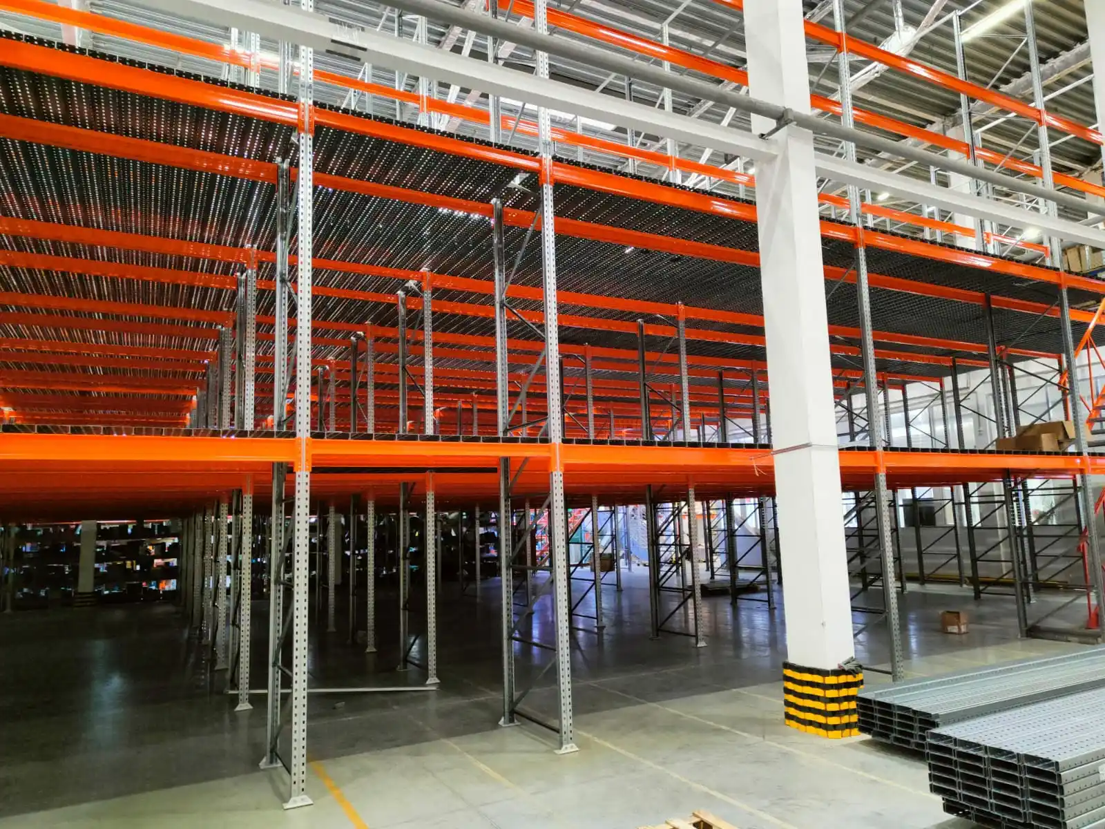 - Ригели и траверсы (горизонтальные элементы) покрытие: полимерно-порошковое, цвет рыжий (RAL 2004), перекрытия пола - балка профиля "восьмерка" 150 мм, основные полочные ярусы профиль Z.