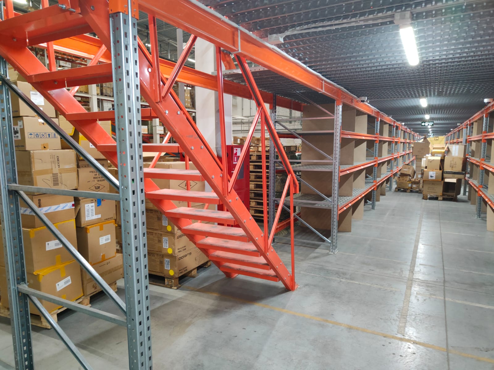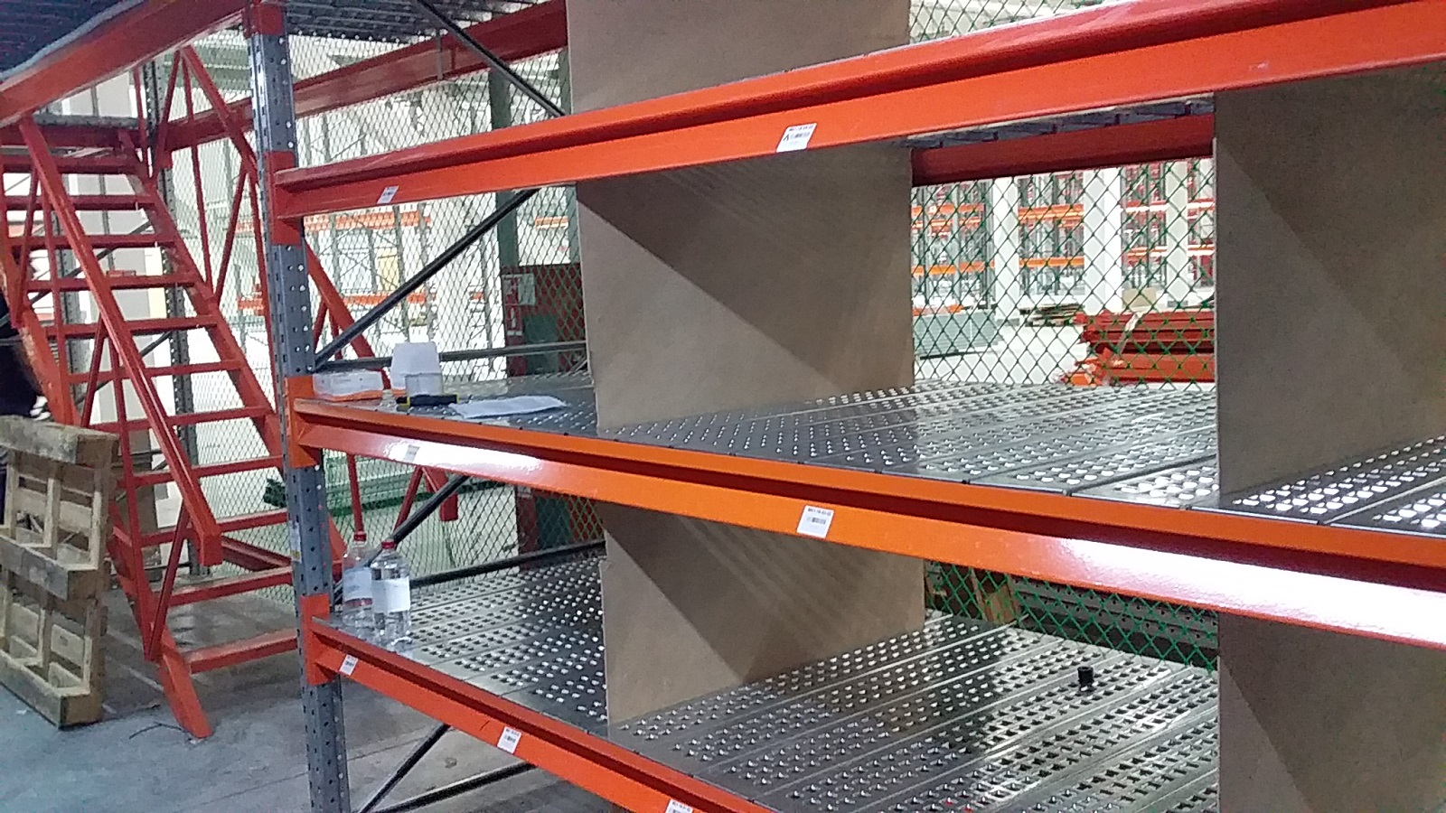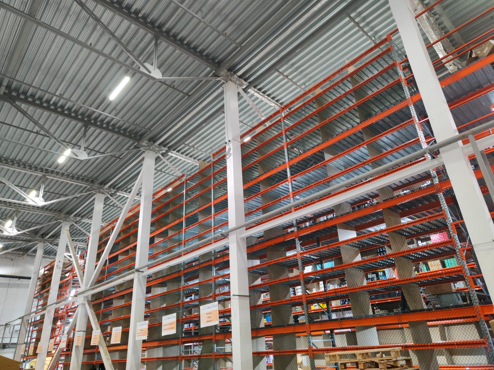 - Стояла задача: максимально реализовать доступное пространство для полочного хранения, использовать только проливной настил для пожарной безопасности