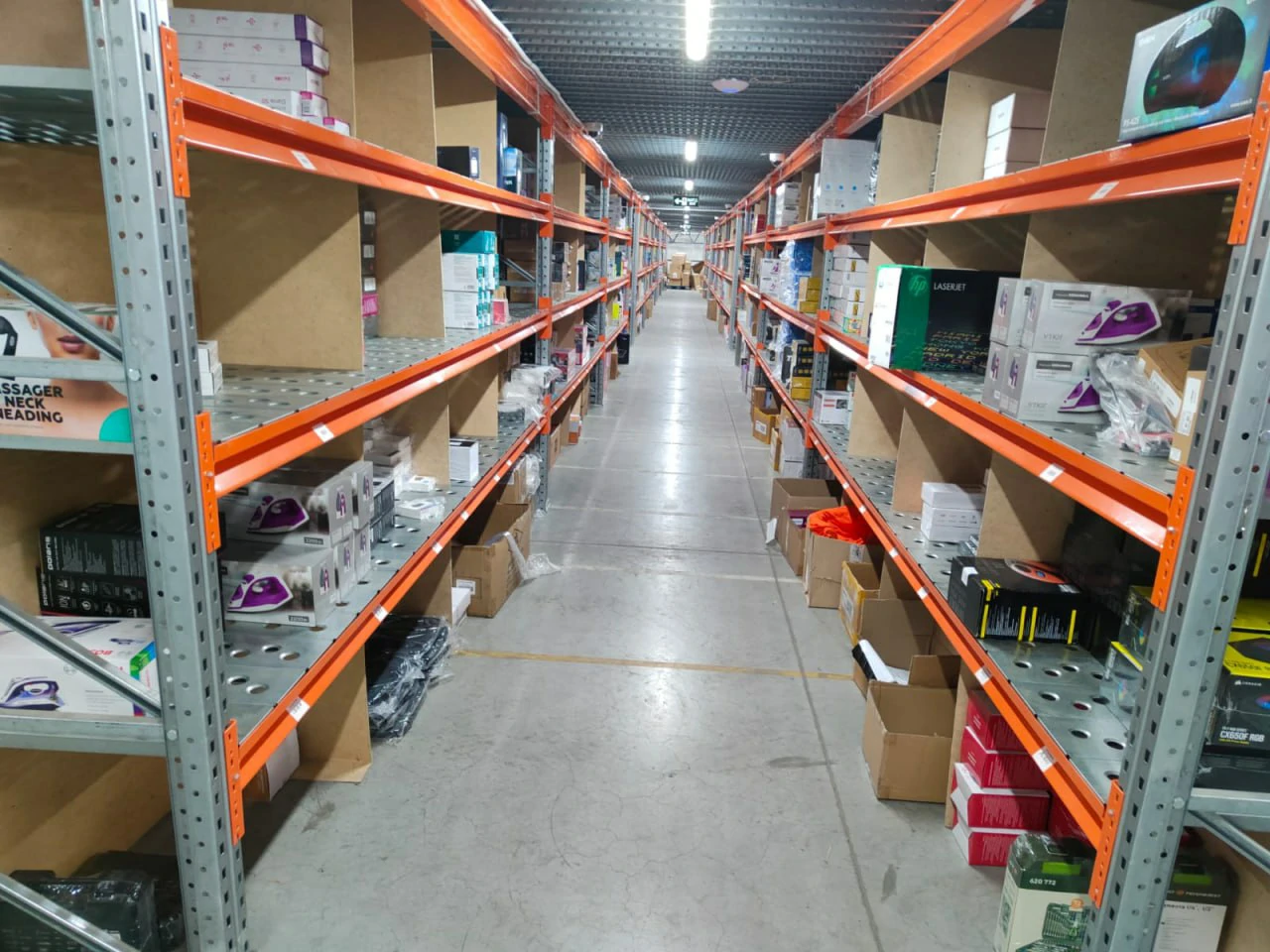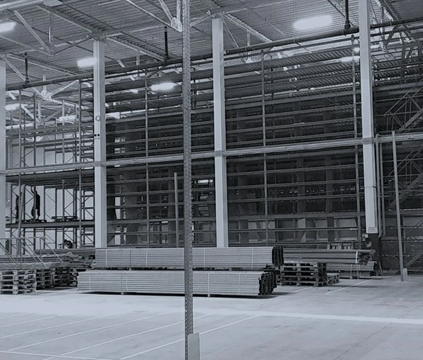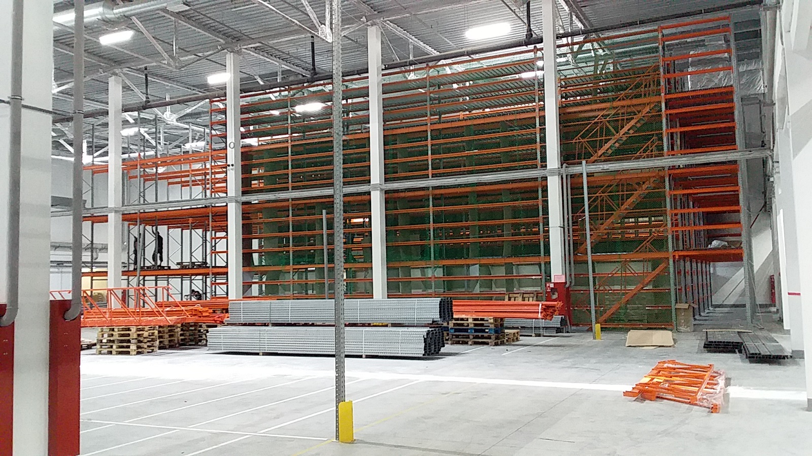 - Стояла задача: максимально реализовать доступное пространство для полочного хранения, использовать только проливной настил для пожарной безопасности