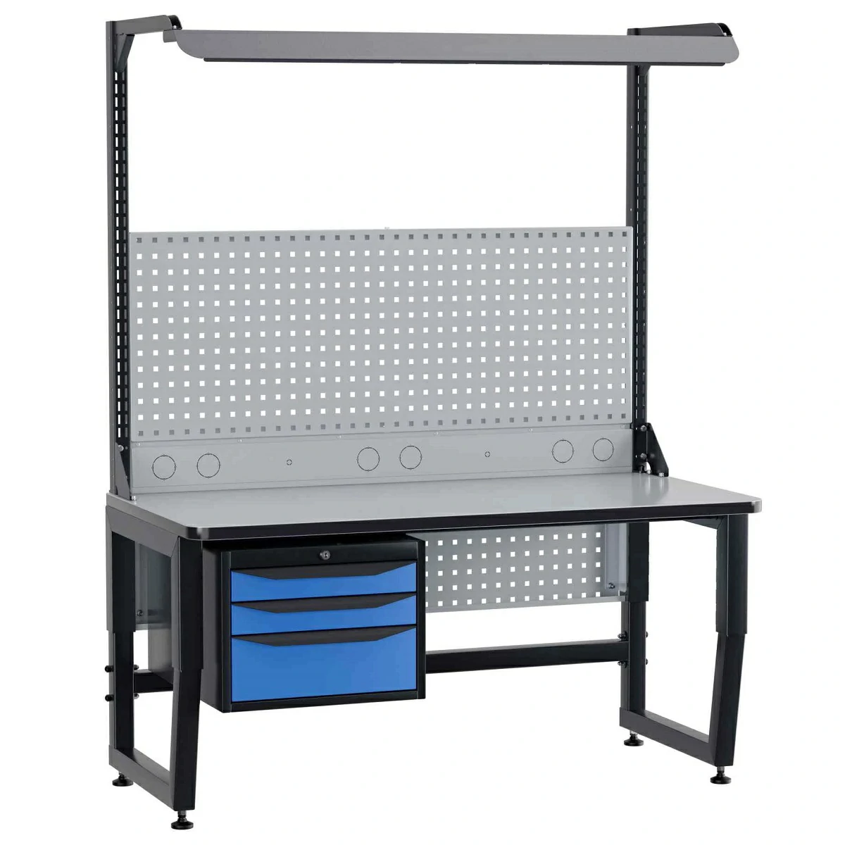 - Столешница: основа — МДФ (30 мм), поверхность — сертифицированный ESD‑пластик (1 мм), нижняя часть — БСП‑пластик (1 мм), кромка — ABS‑пластик (2 мм).