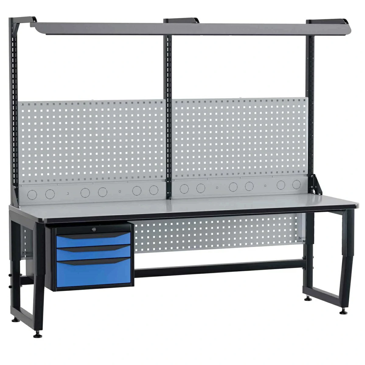 - Столешница: основа — МДФ (30 мм), поверхность — сертифицированный ESD‑пластик (1 мм), нижняя часть — БСП‑пластик (1 мм), кромка — ABS‑пластик (2 мм).