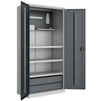 - Укомплектован тремя полками, двумя выдвижными ящиками, перфорированным экраном с навесными аксессуарами (держатель для ключей, держатель для отвёрток, полка навесная и лоток навесной).