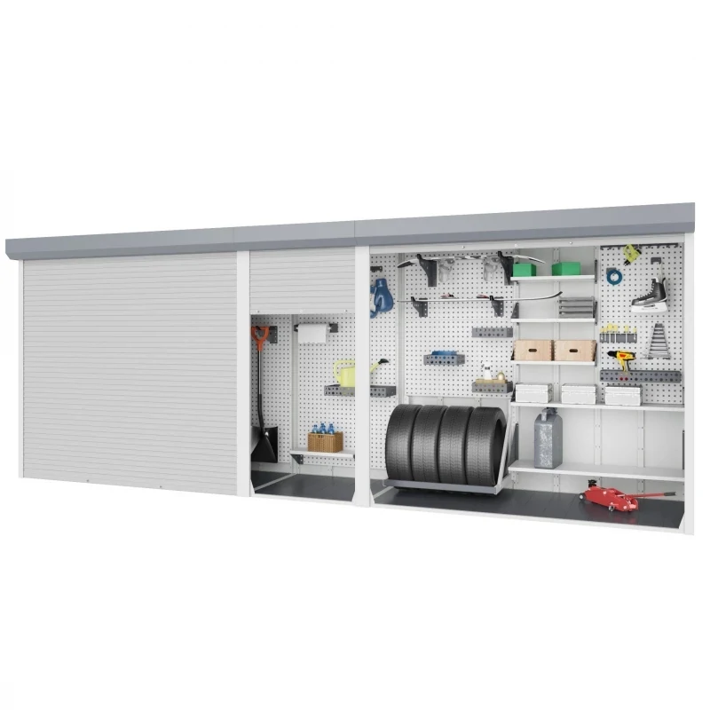 Трёхсекционные роллетные шкафы представляют собой сборно-разборную конструкцию, состоящую из набора панелей, двух соединительных рам и трёх комплектов рольставней, которые соединяются между собой при помощи винтового соединения с внутренней части шкафа. Рольставни могут иметь различные размеры по ширине, в зависимости от требований. Составные панели выполнены из конструкционной листовой оцинкованной стали ГОСТ 14918 толщиной 1.0мм. Составные элементы окрашены порошковой краской, стандартный цвет RAL 7047 окраска, дополнительно защищает элементы шкафа и придаёт необходимый вид (рольставни стандартно окрашиваются в светло-серый цвет, возможность изменения цвета рольставней по запросу).Шкаф предназначен для хранения различных вещей и инструмента, устанавливается в крытых помещениях, паркингах или под навесом на прочную поверхность (бетонная или деревянная поверхность). В шкаф дополнительно можно установить стеллажи, на боковые и заднюю стенки перфорированные панели (для установки навесных удерживающих элементов), различные полки, в нижнюю часть шкафа пол в виде настилов (набор планок). Устанавливаемые рольставни могут быть как стандартные так и