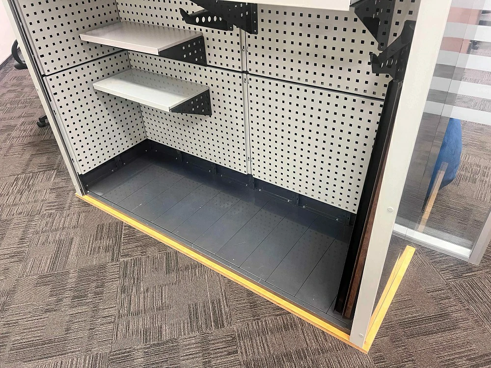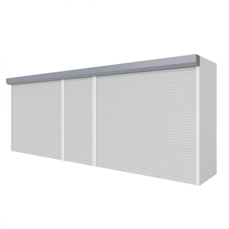 Шкаф представляет собой модульную систему хранения с тремя независимыми роллетными блоками.