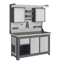 - Экран (перфорированная панель) верстака выполнен с квадратной перфорацией 12х12 мм с шагом 38 мм для установки крючков, держателей и других аксессуаров. Экран крепятся к столешнице с помощью специальных кронштейнов. Максимальная масса груза, равномерно распределенного по поверхности экрана, составляет 71 кг.