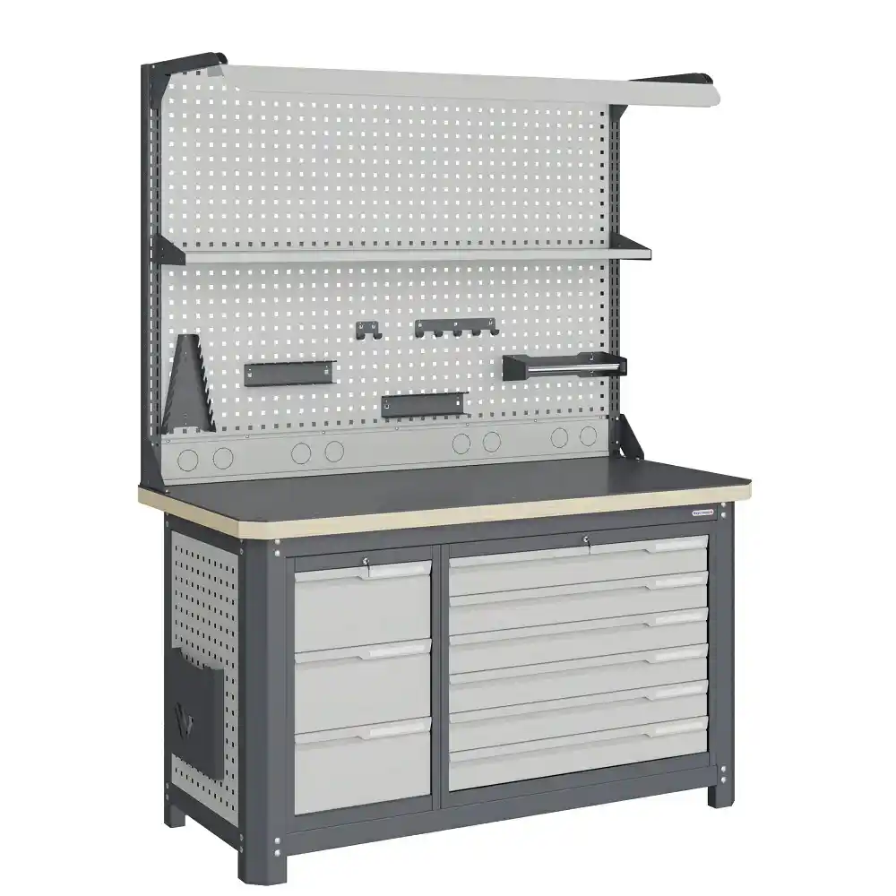 - Экран (перфорированная панель) верстака выполнен с квадратной перфорацией 12х12 мм с шагом 38 мм для установки крючков, держателей и других аксессуаров. Экран крепятся к столешнице с помощью специальных кронштейнов. Максимальная масса груза, равномерно распределенного по поверхности экрана, составляет 71 кг.