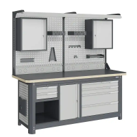 - Экран (перфорированная панель) верстака выполнен с квадратной перфорацией 12х12 мм с шагом 38 мм для установки крючков, держателей и других аксессуаров. Экран крепятся к столешнице с помощью специальных кронштейнов. Максимальная масса груза, равномерно распределенного по поверхности экрана, составляет 71 кг.