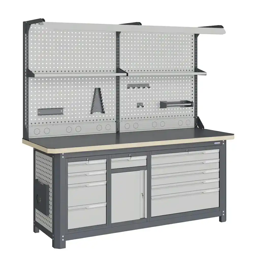 - Экран (перфорированная панель) верстака выполнен с квадратной перфорацией 12х12 мм с шагом 38 мм для установки крючков, держателей и других аксессуаров. Экран крепятся к столешнице с помощью специальных кронштейнов. Максимальная масса груза, равномерно распределенного по поверхности экрана, составляет 71 кг.
