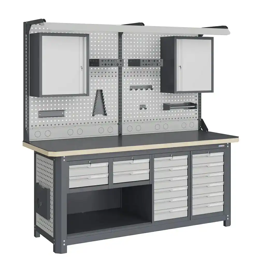 - Экран (перфорированная панель) верстака выполнен с квадратной перфорацией 12х12 мм с шагом 38 мм для установки крючков, держателей и других аксессуаров. Экран крепятся к столешнице с помощью специальных кронштейнов. Максимальная масса груза, равномерно распределенного по поверхности экрана, составляет 71 кг.