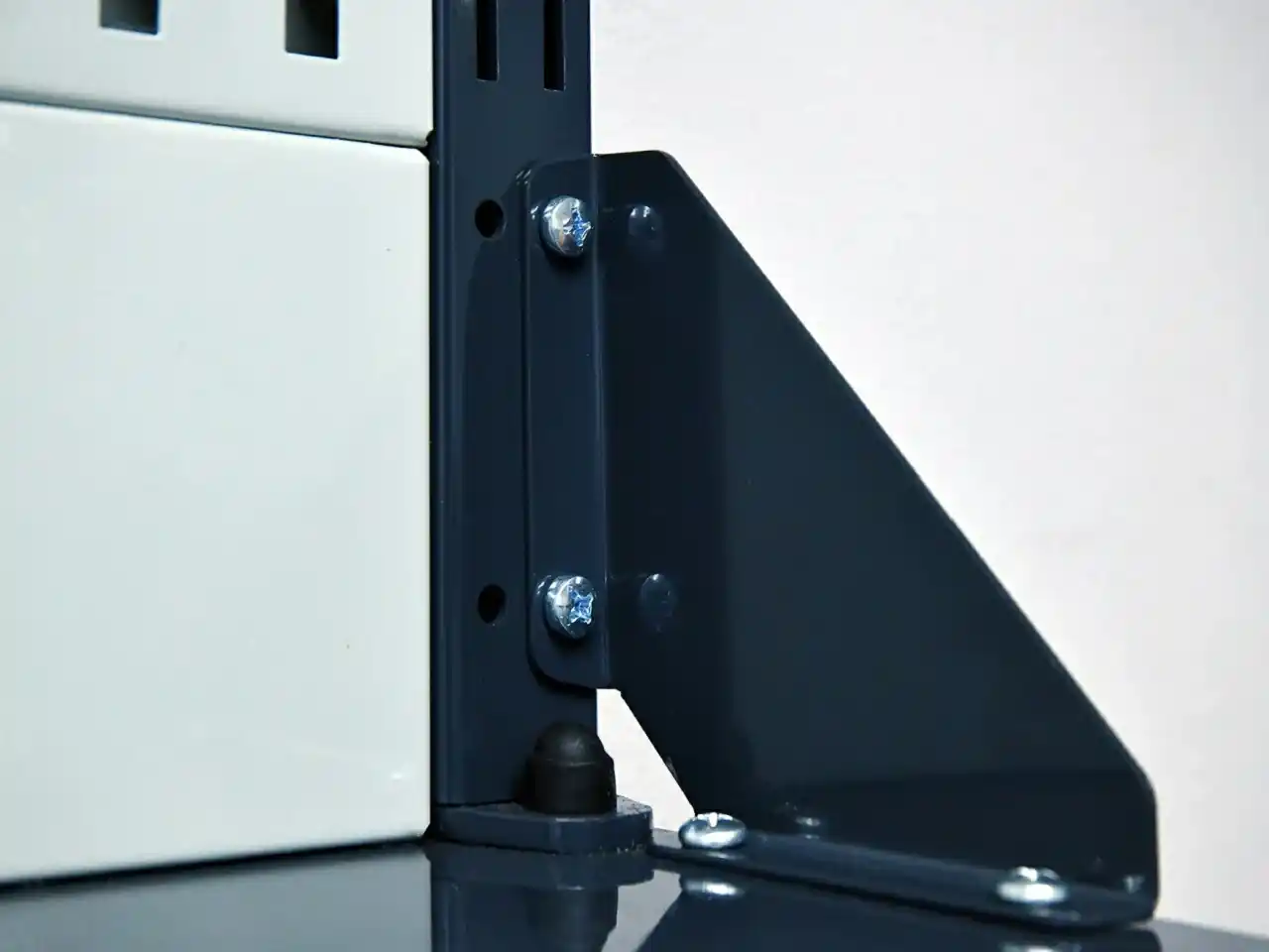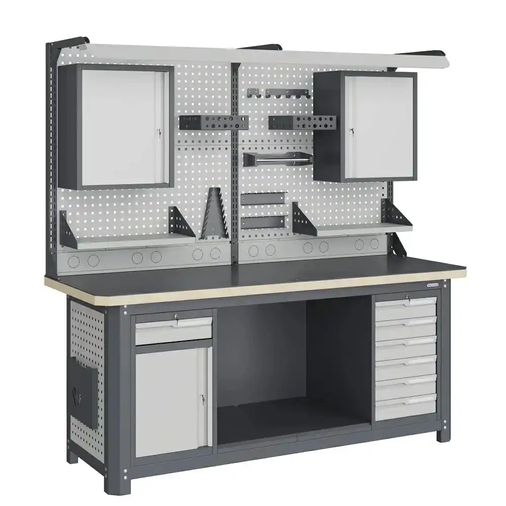 - Экран (перфорированная панель) верстака выполнен с квадратной перфорацией 12х12 мм с шагом 38 мм для установки крючков, держателей и других аксессуаров. Экран крепятся к столешнице с помощью специальных кронштейнов. Максимальная масса груза, равномерно распределенного по поверхности экрана, составляет 71 кг.
