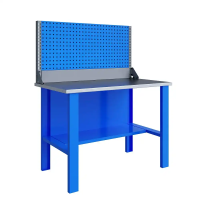- Опорные элементы выполнены сварными из холоднокатаной стали. Верстак комплектуется полкой-стенкой, расположенной под столешницей для удобного размещения габаритного инструмента и оснастки.
