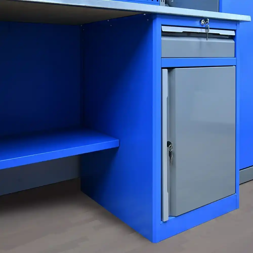 - Тумба верстака - сварная. Ящики в тумбе устанавливаются на шариковых телескопических направляющих полного выдвижения. В тумбе P8 установлен малый ящик и имеется отделение с дверью и одной полкой. Внутренние размеры малых ящиков (ВхШхГ), не более: 103 х 397 х 520 мм. Ящик снабжен центральным замком с поворотом ригеля 180 градусов и подпружиненной тягой. В комплекте два ключа. Полка устанавливается на парах специальных формованных зацепов, выполненных в боковых стенках тумбы. Имеется возможность смены стороны открывания двери. Дверь тумбы снабжена центральным замком с поворотом ригеля 180º. В комплекте имеется два ключа.