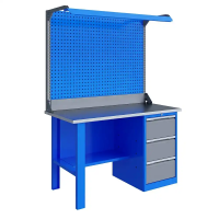 - Верстак комплектуется полкой-стенкой, расположенной под столешницей для удобного размещения габаритного инструмента и оснастки.