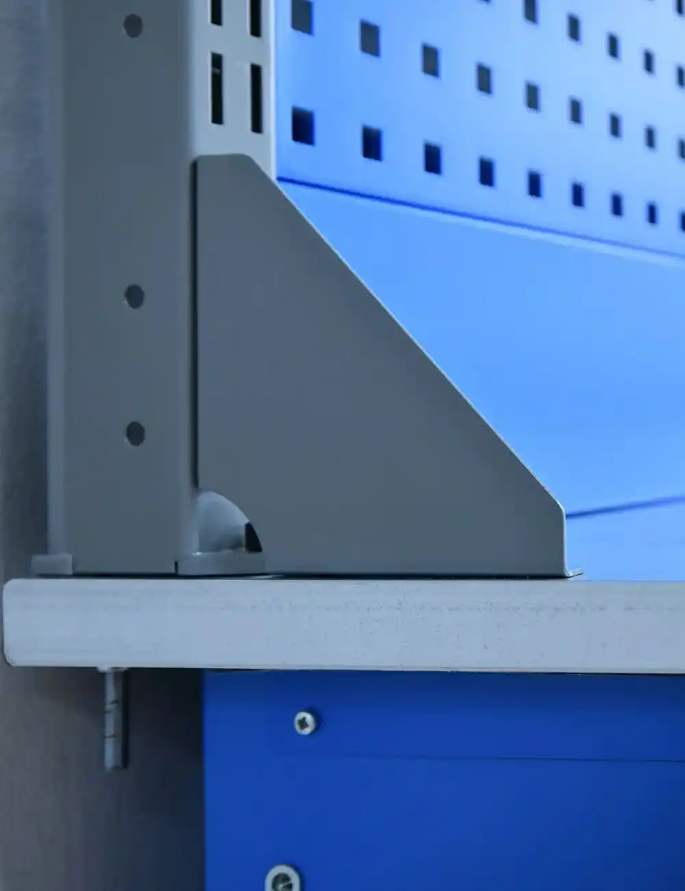 - Двойной экран (перфорированные панели) верстака выполнен с квадратной перфорацией 12х12 мм с шагом 38 мм для установки крючков, держателей и других аксессуаров. Экран крепится к столешнице с помощью специальных кронштейнов. Максимальная масса груза, равномерно распределенного по поверхности экрана - 21 кг.
