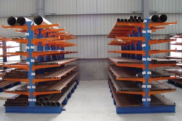 На складе нашего давнего Заказчика смонтированы консольные стеллажи для хранения погонажной продукции (металлических труб). Уровней хранения : 3 + основание. Высота стеллажей 3 метра, длина каждой консоли 0,85 м. Конструкция металлическая, сборно-разборная. Нагрузка на 1 консоль (легкий тип консоли) = 400 кг, нагрузка на весь стеллаж = 51 000 кг. Крепление к полу анкерное.