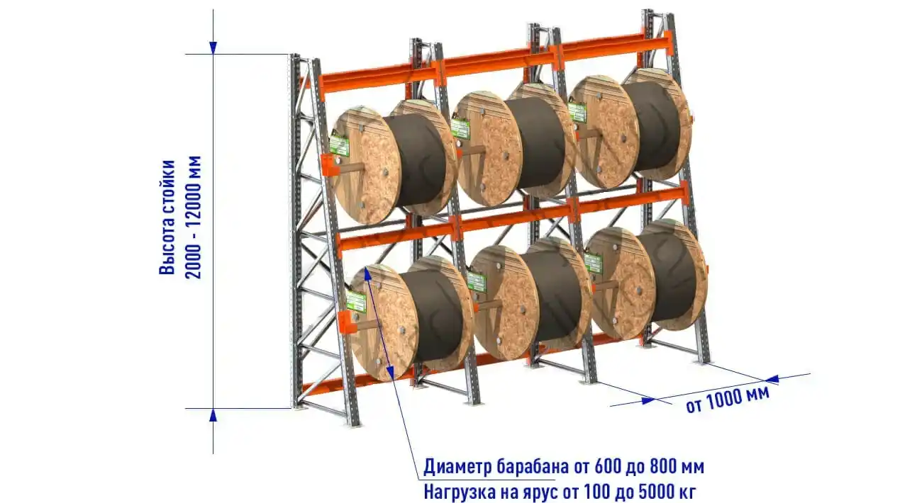 При выборе необходимо учитывать следующие параметры:- Размеры и вес барабанов — диаметр, ширина и вес бухт с кабелем. От корректности этой информации зависит конструкция стеллажа и ее грузоподъемность, количество ярусов и расстояние между ними.