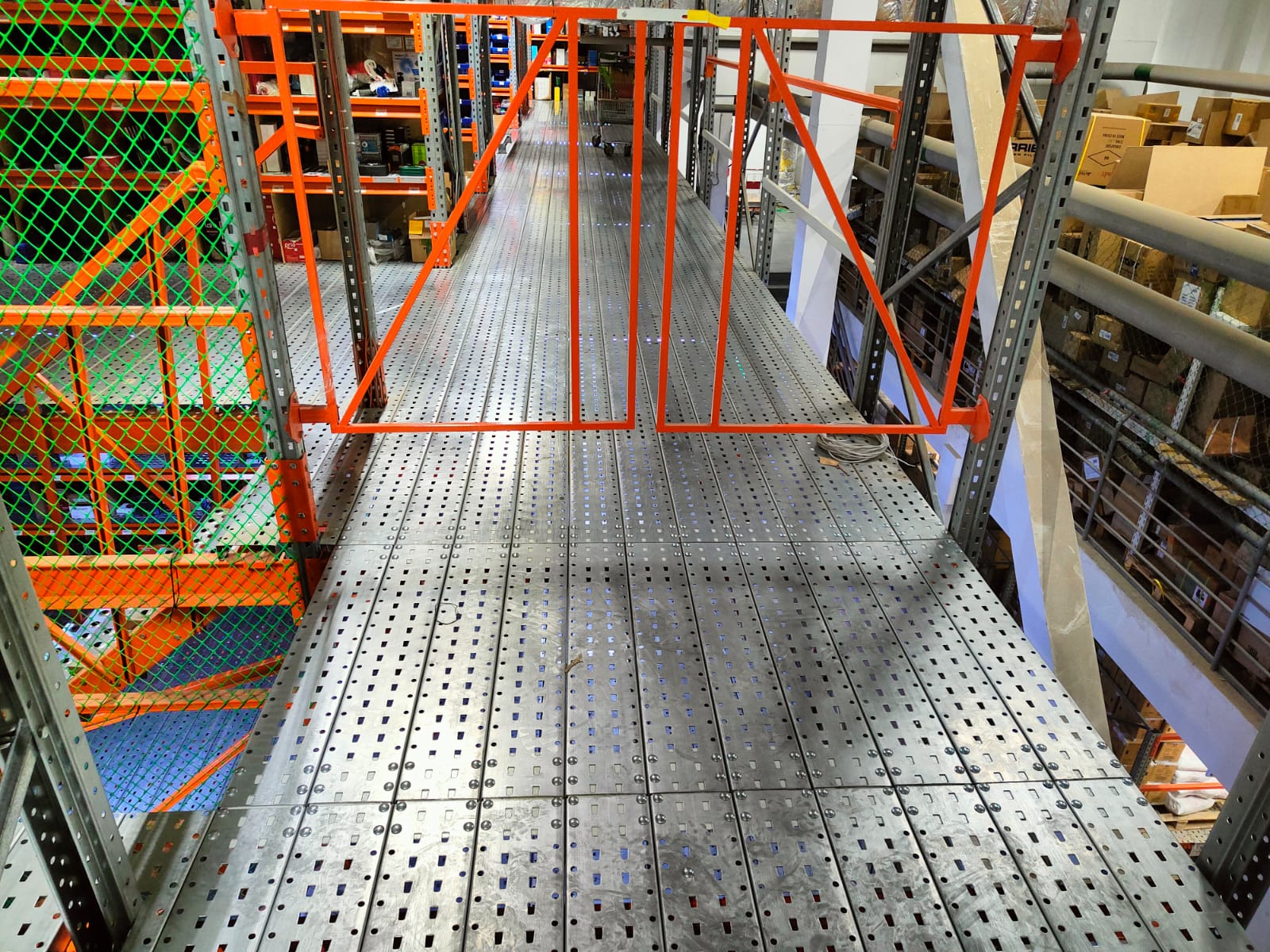 - Стояла задача: максимально реализовать доступное пространство для полочного хранения, использовать только проливной настил для пожарной безопасности