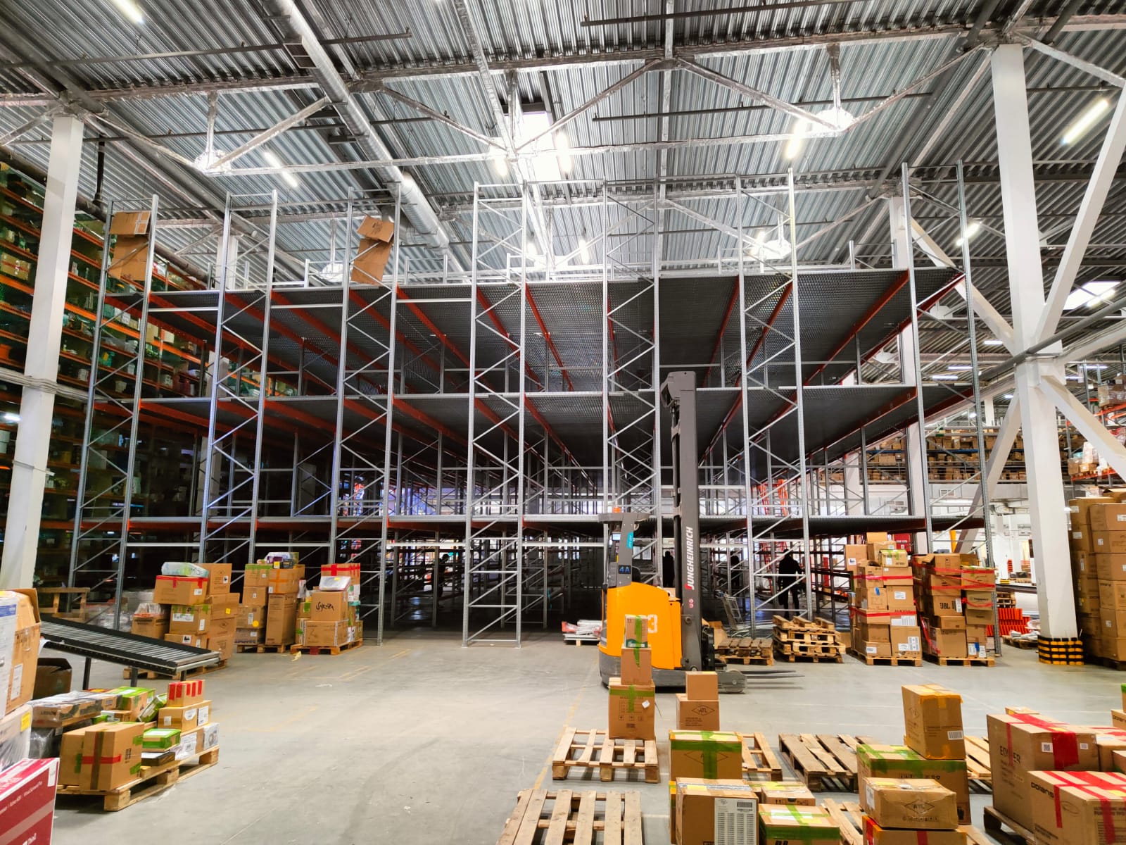 Реализован проект – Мезонин на базе паллетных стеллажей с проливным настилом на полочных ярусах (4 этажа)